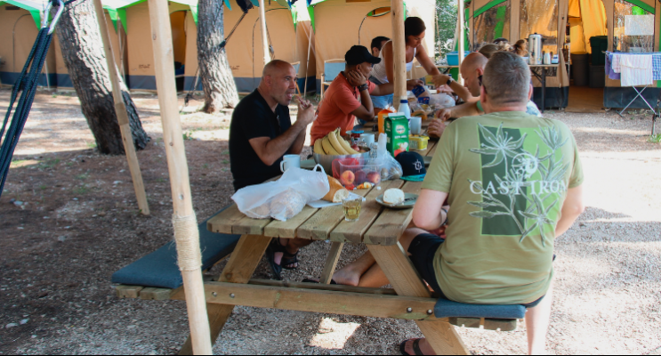 Bestek, borden en alles om te kunnen koken ligt voor je klaar. Je hoeft alleen je koffer mee te nemen! Onze tenten staan gezellig bij elkaar tussen de bomen, zodat je voldoende schaduw hebt. We hebben een eigen gezamenlijk terras (onder een safaritent) waar je gezamenlijk kunt eten, borrelen en een spelletje kan spelen. Even relaxed een boek lezen? Er staan loungestoelen én we hebben hangmatten opgehangen. Instant vakantiegevoel? Check.
